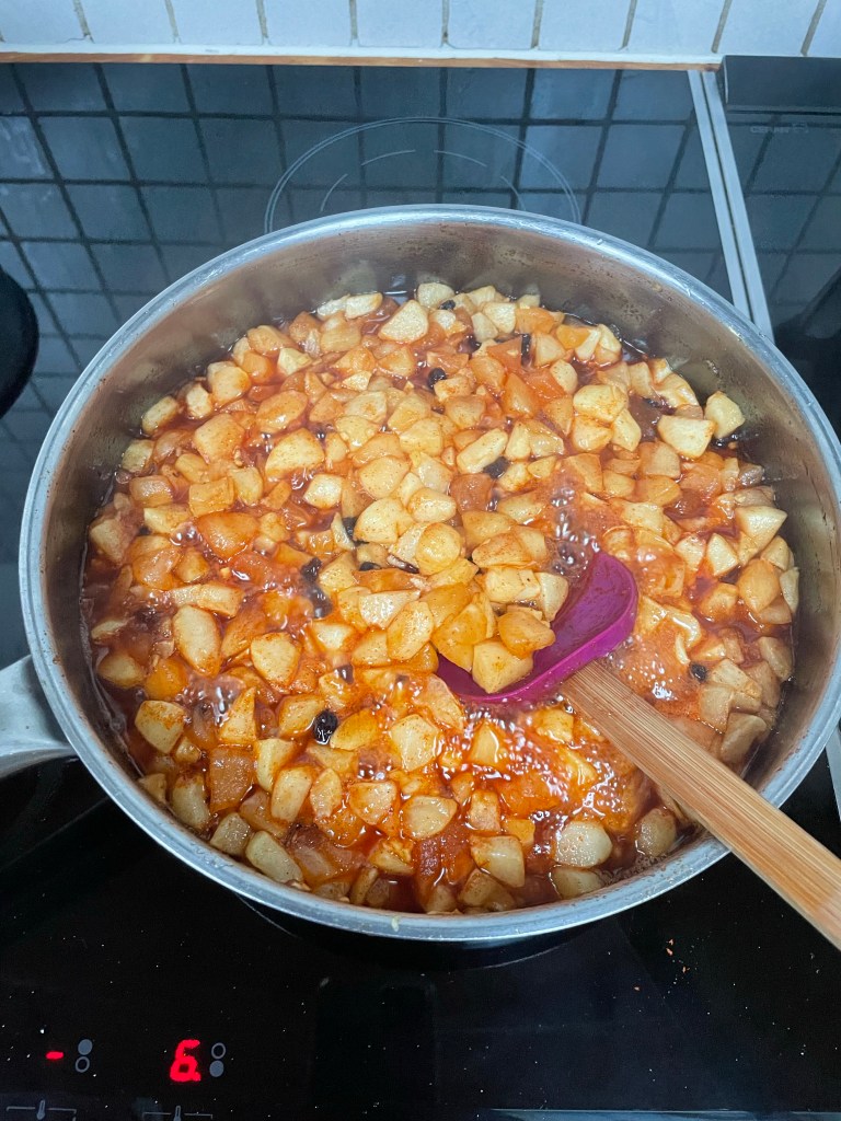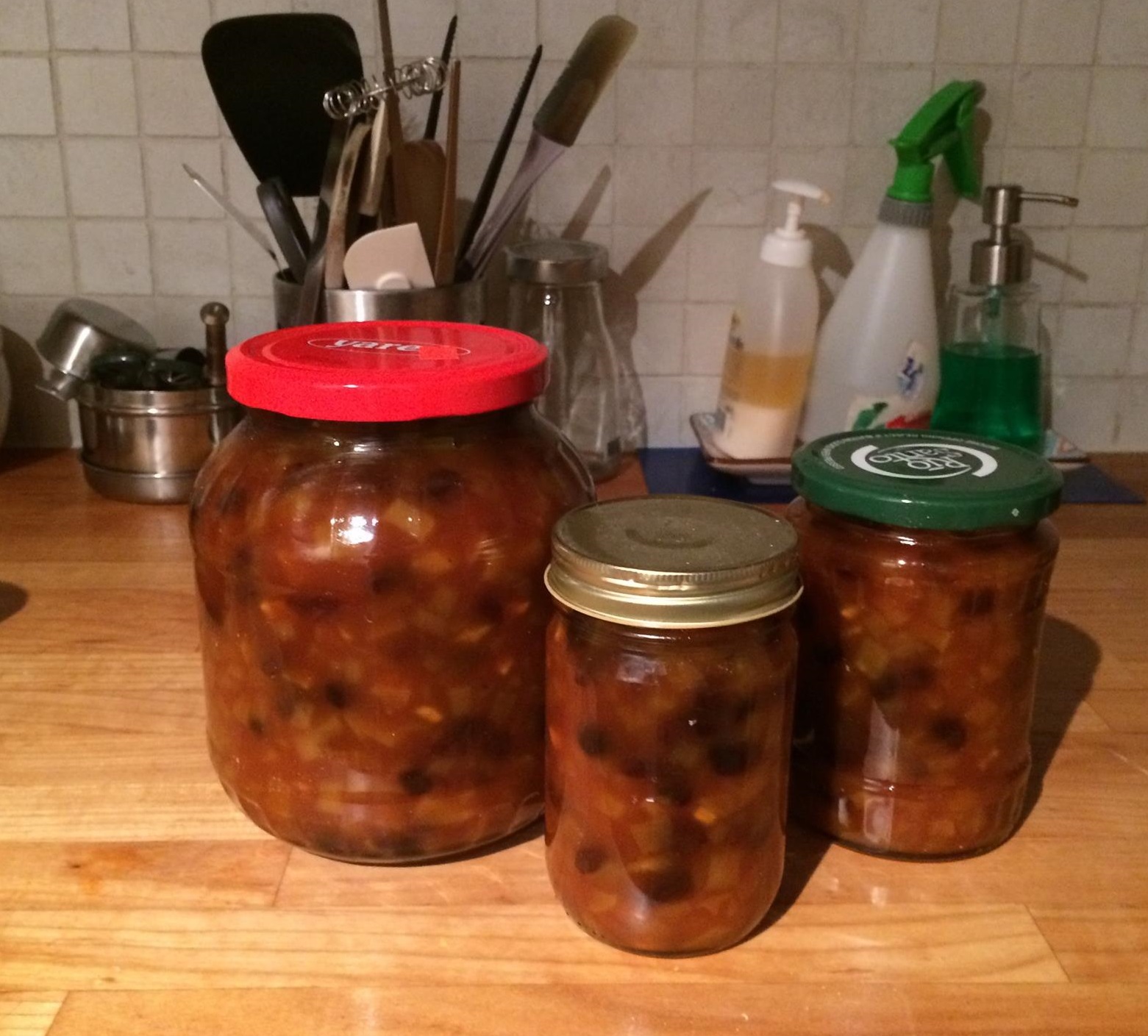 Getting raw mangoes in Oslo is not that easy. So I decided to try the mango chutney recipe with apples. As you can see, I dropped the garlic and cashews. Ginger, raisins and apples work really well together. The chutney turned out really good.