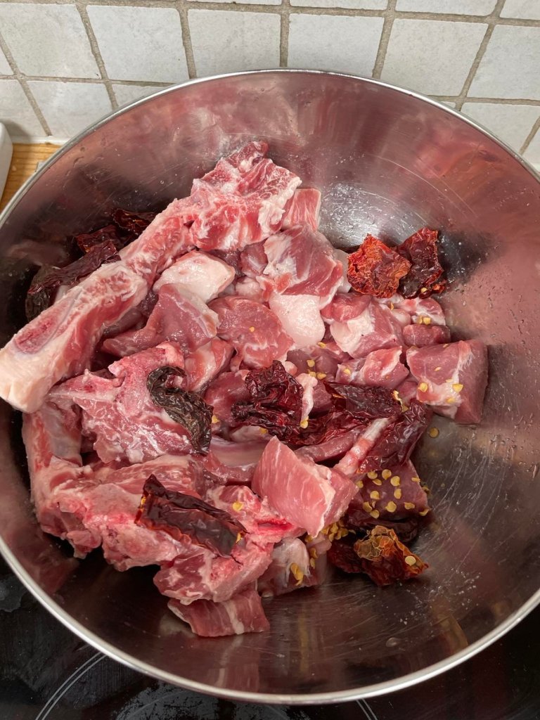 Marinate the pork with salt and Kashmiri chilli and leave for an hour.